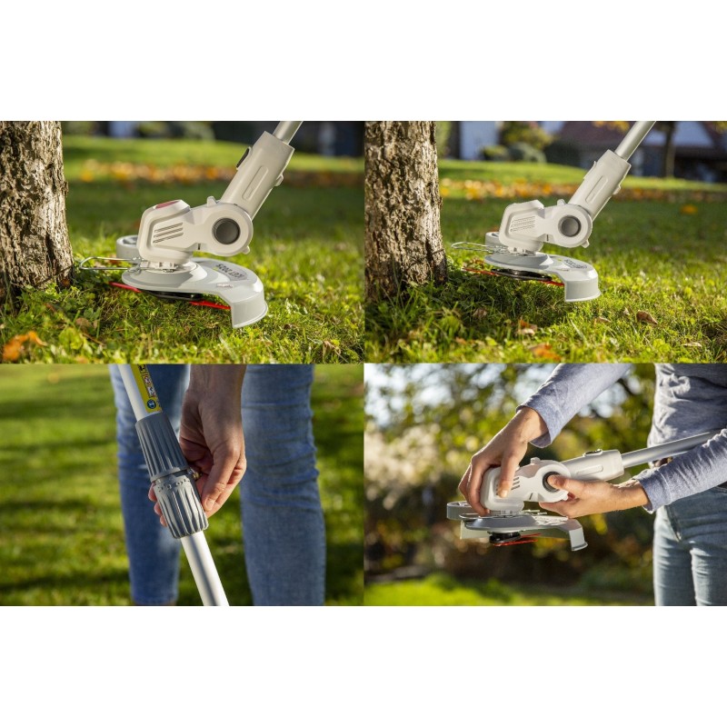 Free Warranty: 24 mėn.Practicality, convenience, high quality and reliability are the features of IKRA garden equipment. This trimmer has a 5-position tilting head to help you reach even hard-to-reach places, and thanks to the ability to cut in a vertical position, you will be able to cut the grass right next to the fence. The product has an easily adjustable telescopic handle and edge roller, the nylon blades cutting system will allow you to easily cut thick grass and bushes.