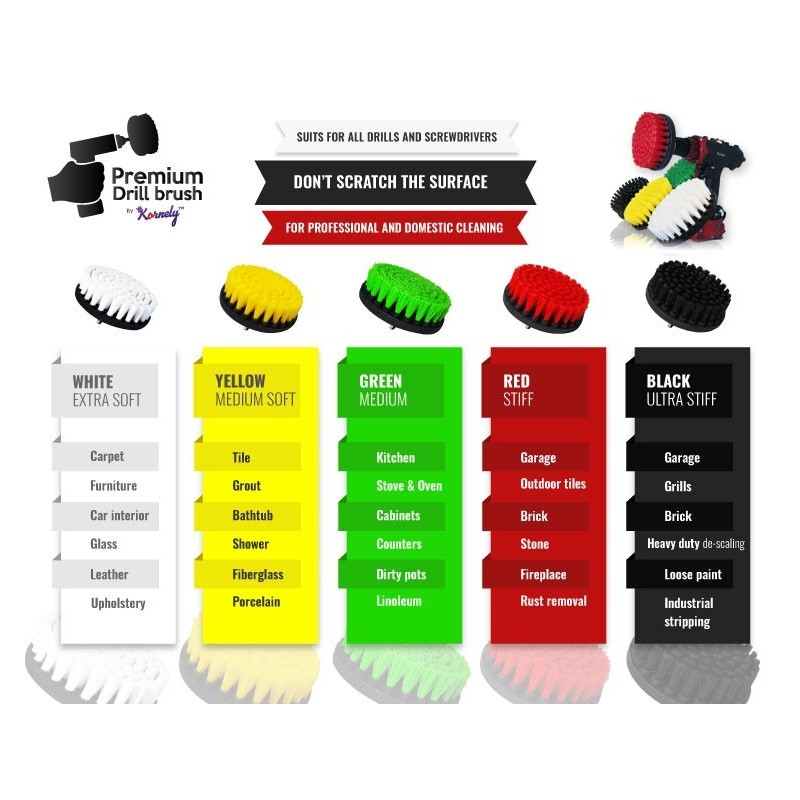 Kornely Premium Drill Brush Professional ir īpaši izveidots, lai ātri un izcili izpildītu dažādus tīrīšanas pienākumus. Augstākās kvalitātes urbju birstes ir lieliski piemērotas tīrīšanas darbiem iekšpusē un ārpusē, ieskaitot lieljaudas darbus. Birstes nesaskrāpē virsmu un neietekmē krāsu.